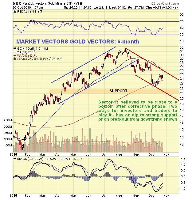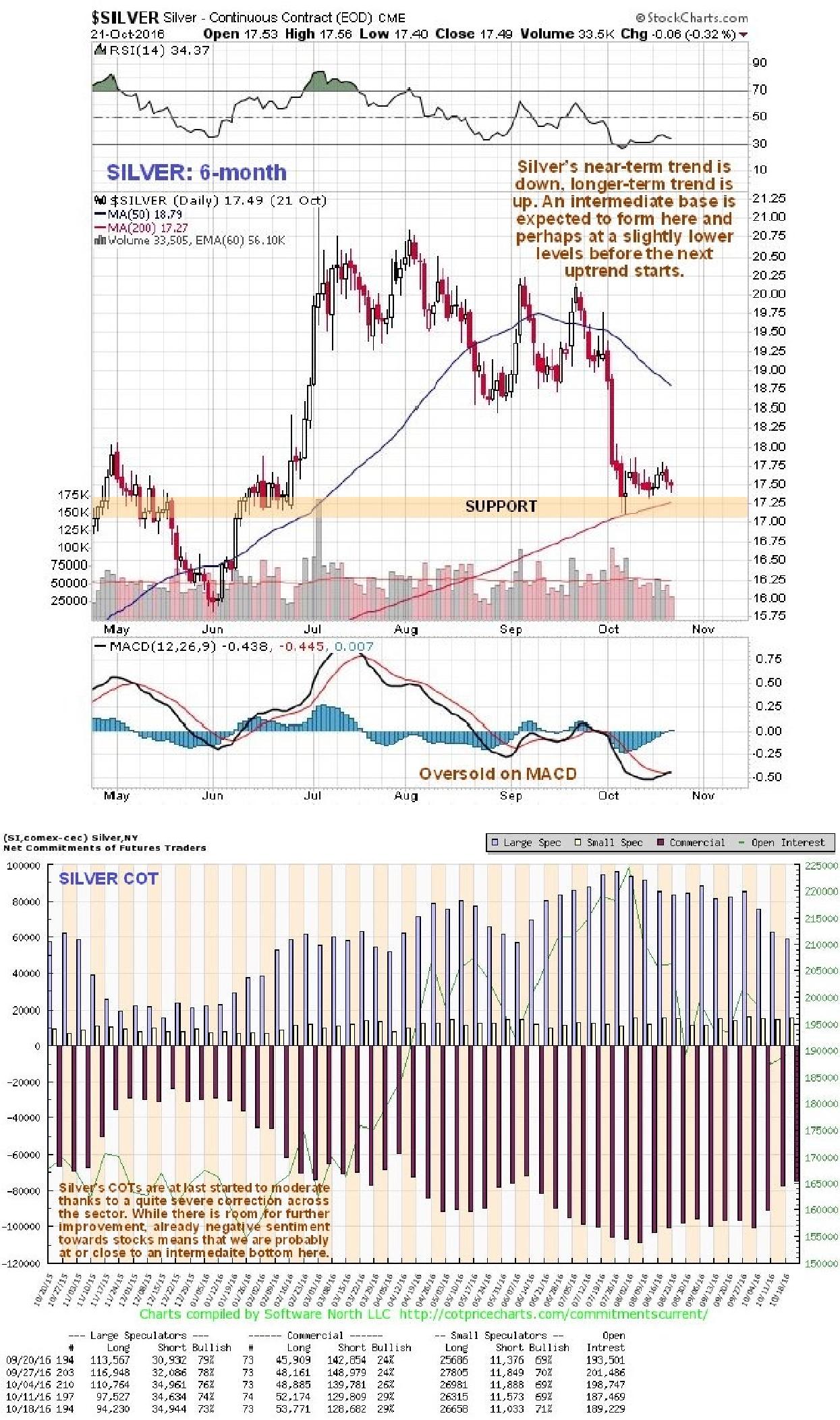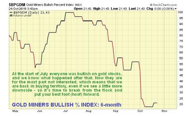 The current low sentiment readings for Precious Metal stocks are an indication that we are either at or close to an intermediate sector bottom here. The Gold Miners Bullish Percent Index chart shown below makes this clear. Putting this together with the COTs, it looks like we are early in a sector basing process here, which could continue for some weeks. Although we may see some further downside in gold and silver, the downside in PM stocks is regarded as limited, due to them having already corrected hard so that we only have a 21.4% bullish rating for stocks. This means that it makes sense to start moving in and buying the best stocks on down days, which is precisely what we have been doing during the past couple of weeks.