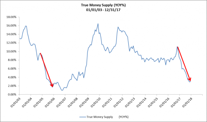 Jeffrey Peshut at RealForecasts.com has composed several very illuminating graphs based on the Rothbard-Salerno True Money Supply (TMS). In one graph Peshut shows the collapse of the growth rate of TMS beginning at the end of 2016, which was caused by the Fed beginning to raise the fed funds target rate at the end of the preceding year. What is of great interest is that the recent deceleration of monetary growth (the second red arrow) almost exactly matches in extent and rapidity the monetary deceleration (the first red arrow) that immediately preceded the financial crisis of 2007-2008.
